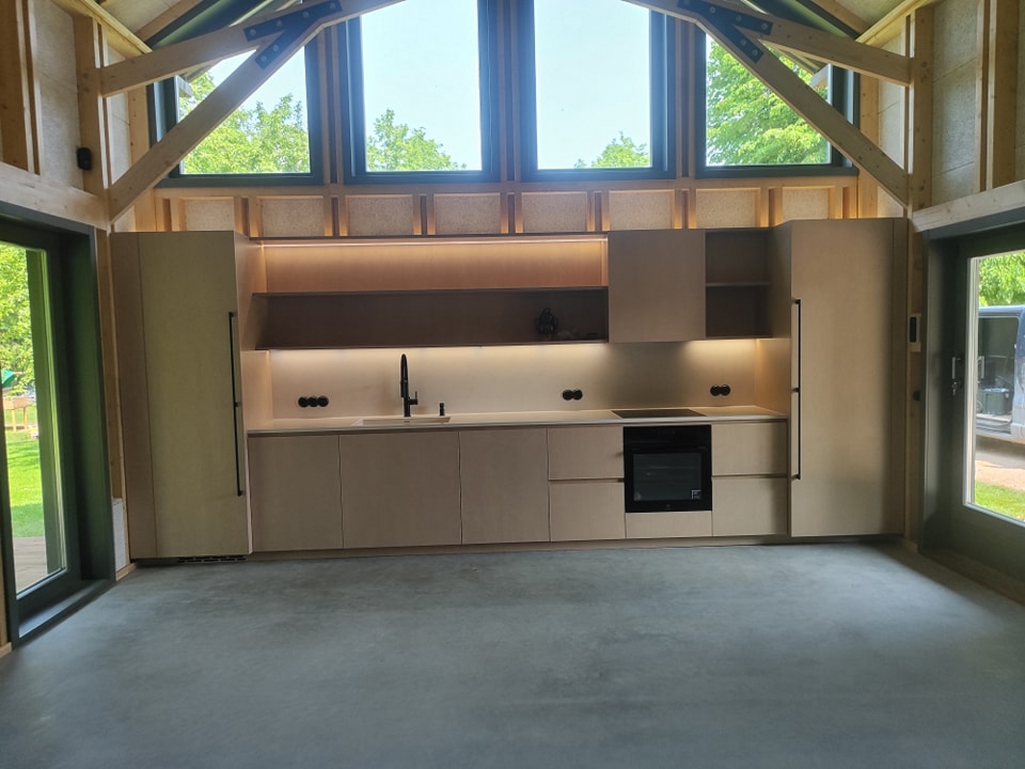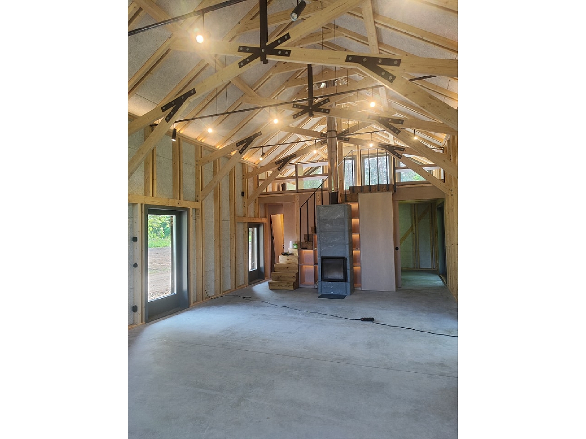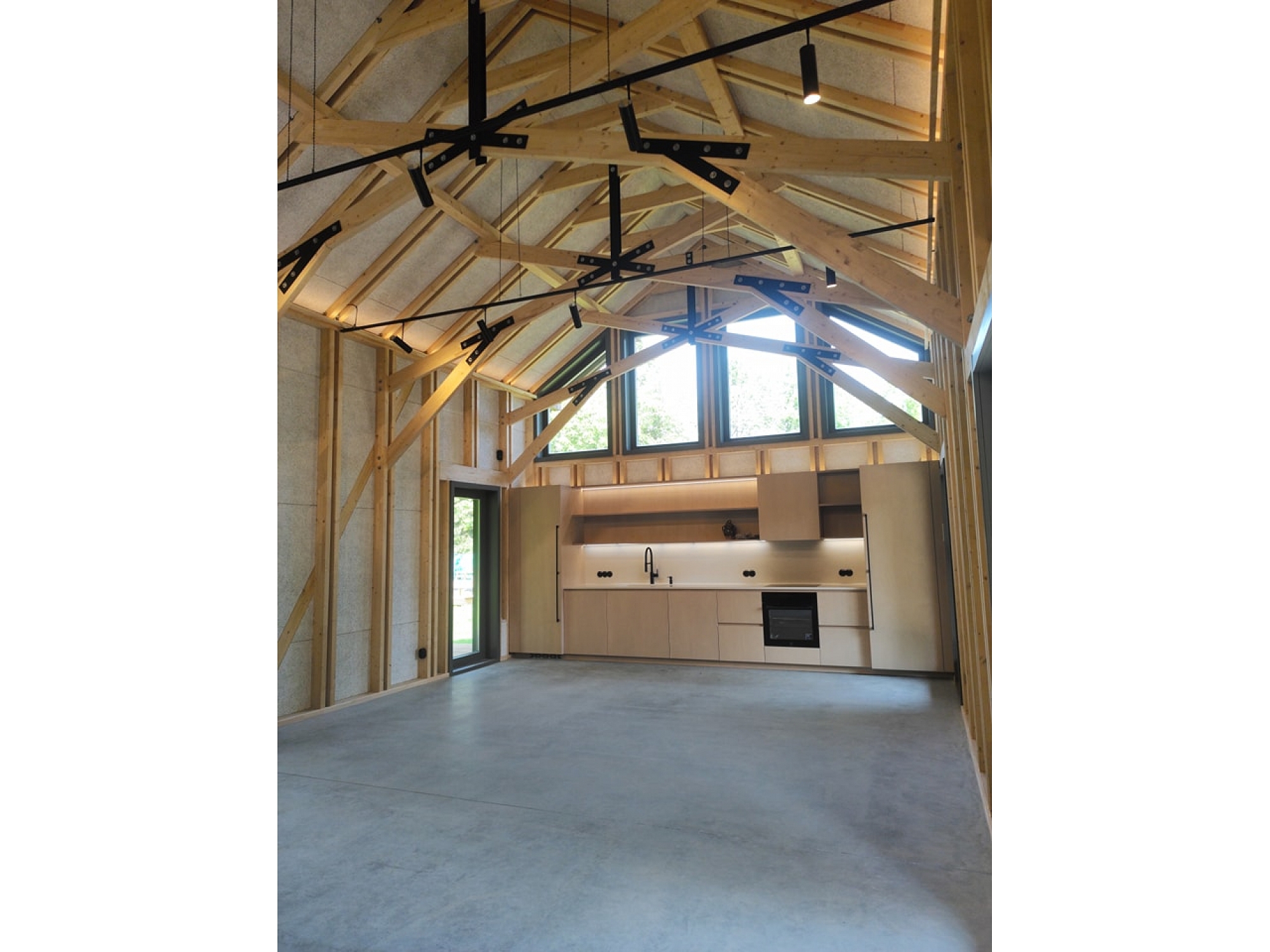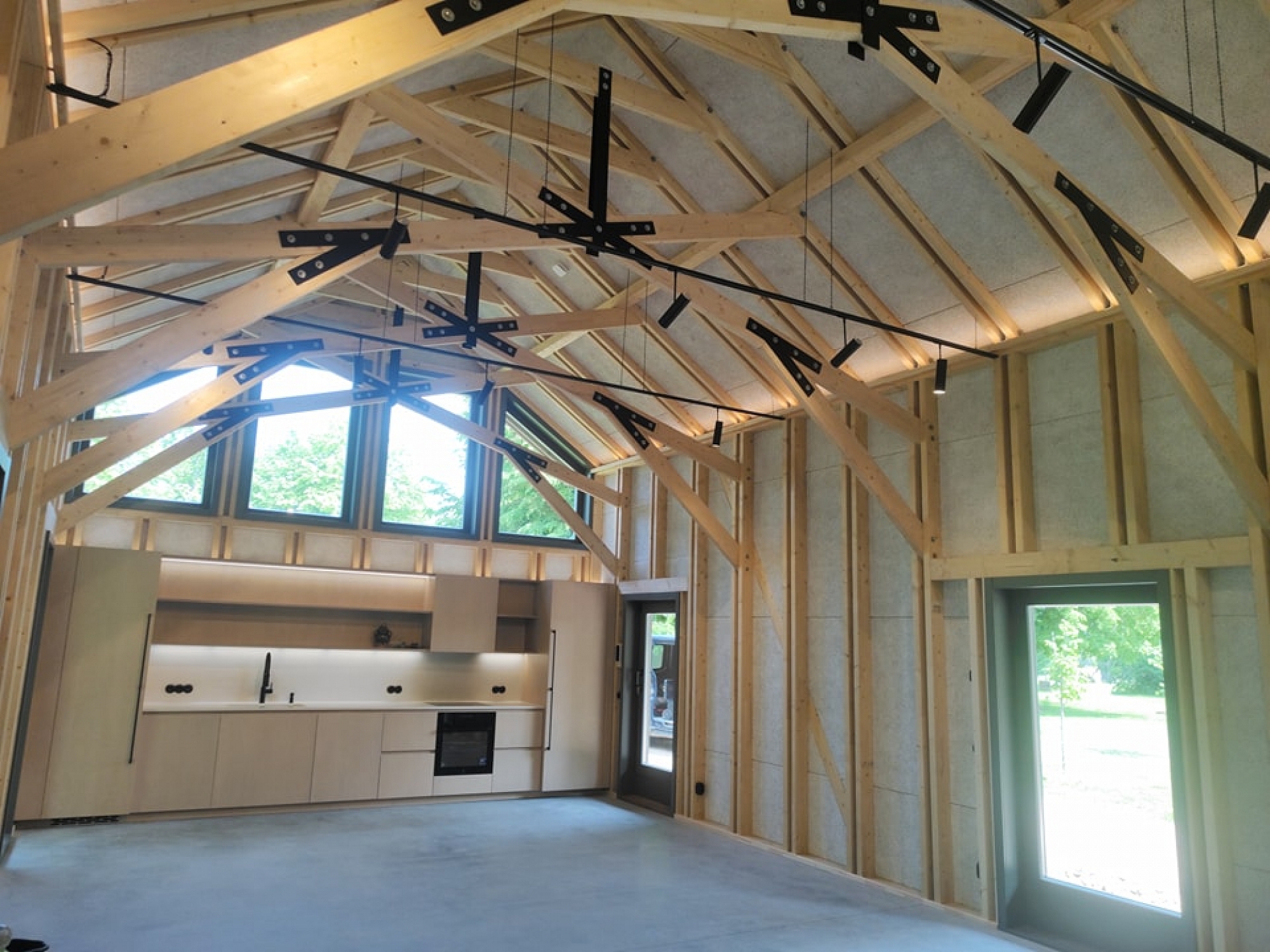 Moderns koka mājas interjers ar augstiem griestiem un sijām