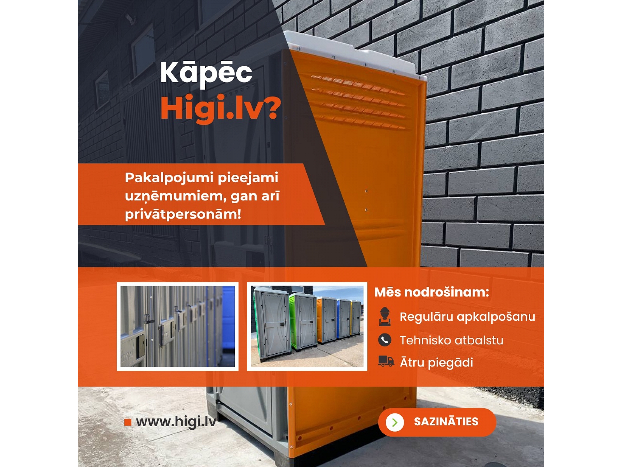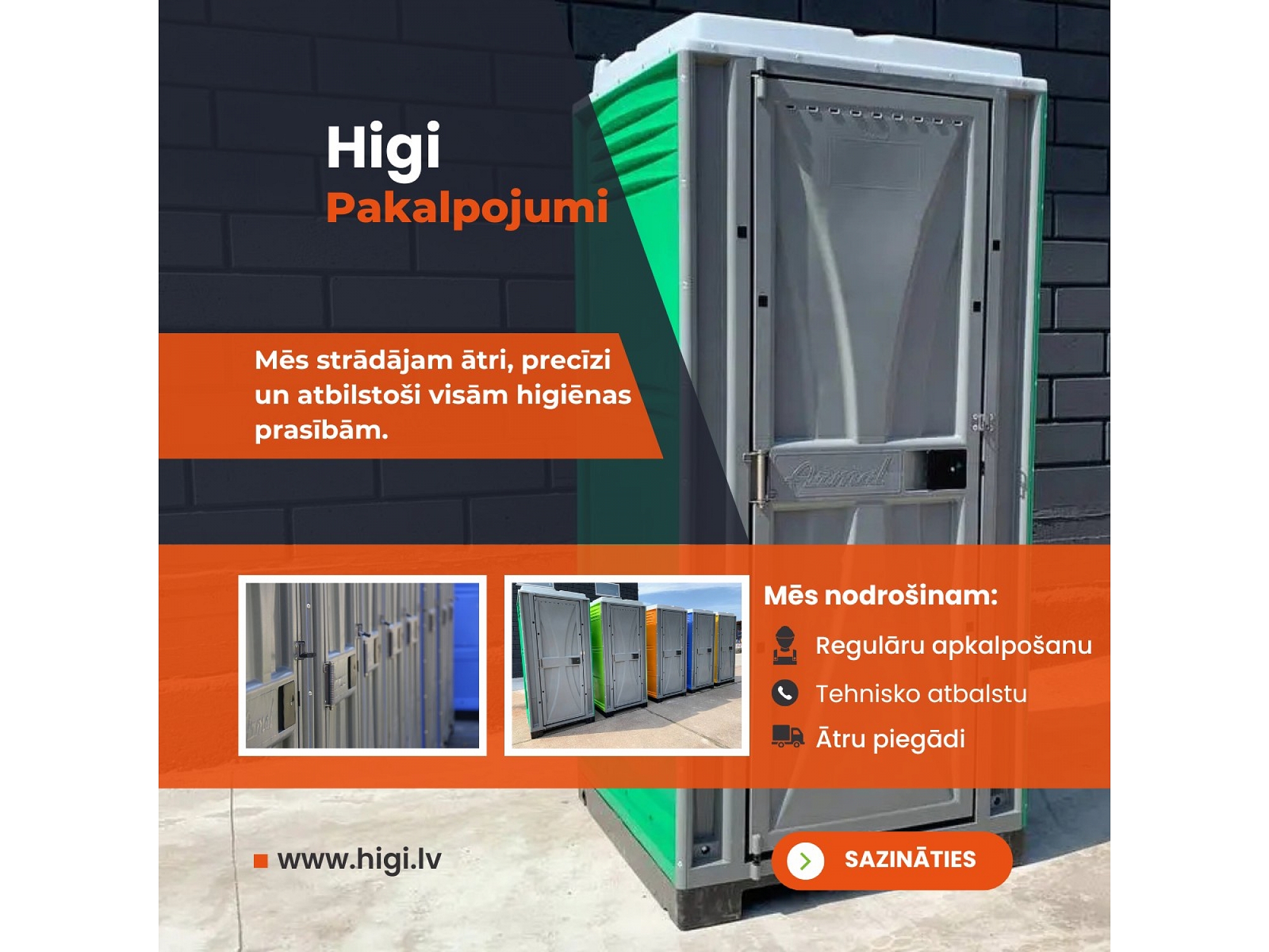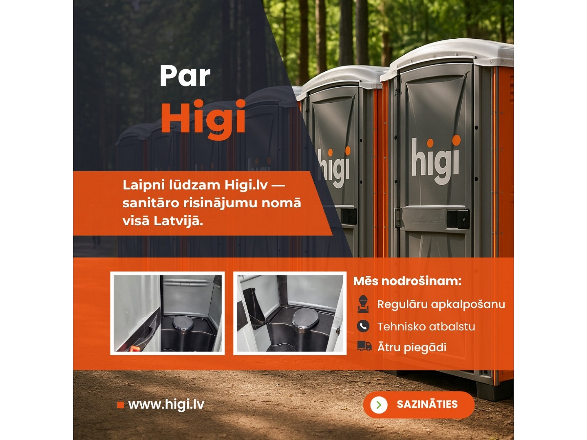 "Higi" ir vadošais portatīvo tualetes kabīņu nomas un pārdošanas pakalpojumu sniedzējs Latvijā. Mēs piedāvājam modernus un ērtus sanitāros risinājumus gan būvobjektiem, gan privātiem pasākumiem, kā arī tualetes kabīnes privātpersonām. Mūsu piedāvājumā ir biotualetes, portatīvās tualetes, tualetes kabīnes ar papildu komfortu, kā arī specializētie sanitārie risinājumi. "Higi" nodrošina ātru piegādi un uzstādīšanu, kā arī kvalitatīvu apkalpošanu, lai Jūsu pasākums vai būvniecība noritētu gludi un bez problēmām. Mēs esam Jūsu uzticamais partneris higiēnas risinājumu nodrošināšanā visā Latvijā.