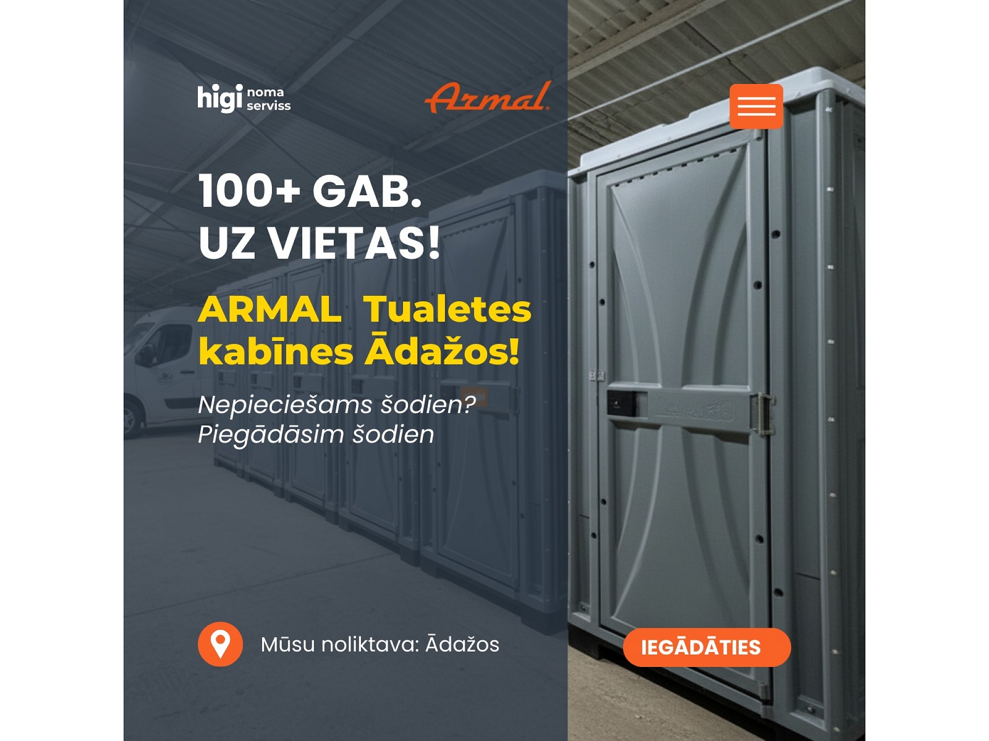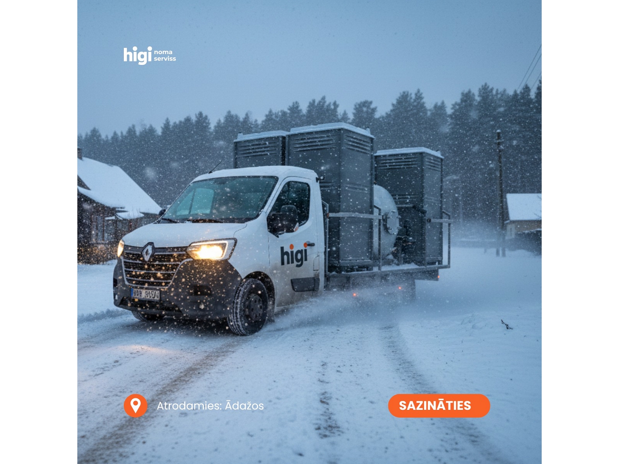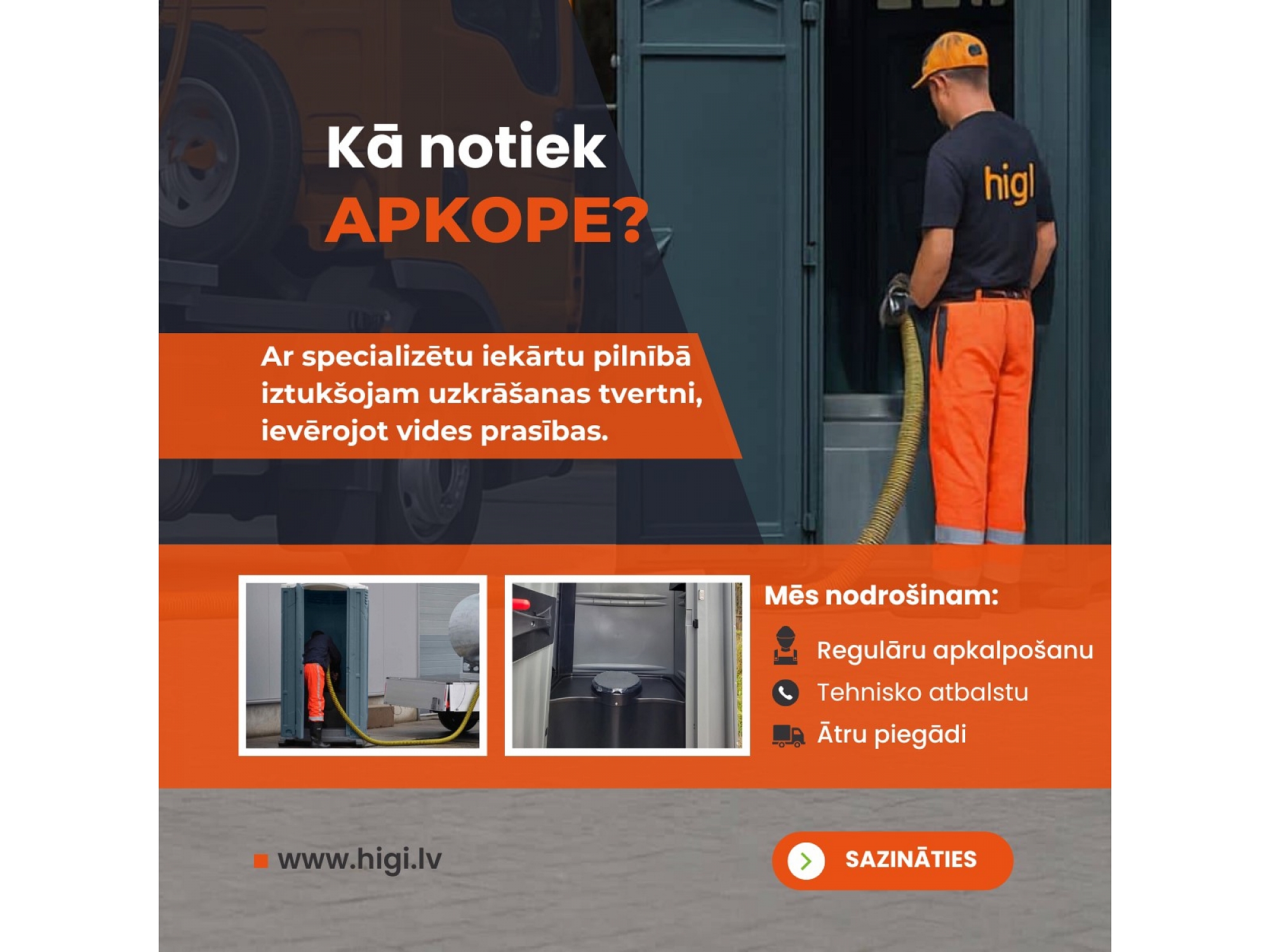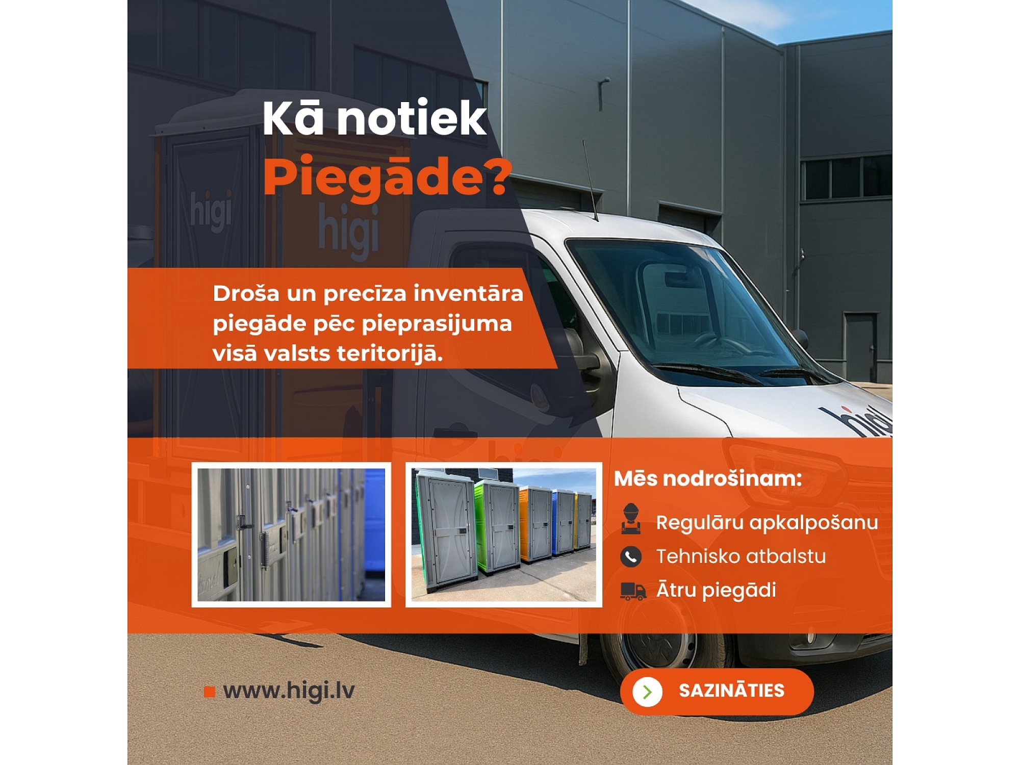 "Higi" ir vadošais portatīvo tualetes kabīņu nomas un pārdošanas pakalpojumu sniedzējs Latvijā. Mēs piedāvājam modernus un ērtus sanitāros risinājumus gan būvobjektiem, gan privātiem pasākumiem, kā arī tualetes kabīnes privātpersonām. Mūsu piedāvājumā ir biotualetes, portatīvās tualetes, tualetes kabīnes ar papildu komfortu, kā arī specializētie sanitārie risinājumi. "Higi" nodrošina ātru piegādi un uzstādīšanu, kā arī kvalitatīvu apkalpošanu, lai Jūsu pasākums vai būvniecība noritētu gludi un bez problēmām. Mēs esam Jūsu uzticamais partneris higiēnas risinājumu nodrošināšanā visā Latvijā.